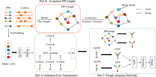 蛋白质相互作用(PPI)的研究对于生物医学发展至关重要,对PPI的深入理解可以为正常和疾病状态下的细胞生理学提供更多的见解,对基础科学和药物发现具有重大意义。然而,未知PPI预测仍然是一个挑战性的问题。为此,该课题组提出了一种新的神经网络模型AFTGAN,用于预测多种类型PPI。该方法在特征输入方面,除了氨基酸共现相似性和独热编码以外,还添加了含有大量蛋白质生物学信息的语言模型ESM-1b嵌入作为蛋白质序列特征。在网络框架部分,构建了一个基于Transformer编码器的集成网络,包含Attention Free Transformer (AFT) 模块和图注意力网络(GAT)。其中,AFT模块用于对重要蛋白质序列特征信息进行加权计算,而图注意力网络(GAT)主要用于提取蛋白质对的关系特征。在SHS27K和SHS148K数据集上的实验结果显示,AFTGAN优于其他使用随机、深度优先搜索(DFS)和广度优先搜索(BFS)划分的方法。测试集tSTRING数据集的实验结果表明,AFTGAN模型在预测未知PPI方面具有性能优势。