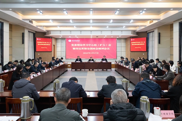 3月17日下午,久久精品一区二区党委理论学习中心组召开学习(扩大)会,传达学习全国两会精神。中心组全体成员出席,二级党组织书记,各职能部门、直属单位负责人,各二级学院院长,附属第一医院院长参加。会议由校党委书记许慧霞主持。