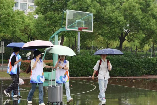 在习习微风和绵绵细雨中,送站车悬挂暖心条幅整齐划一地排列在送站候车点等候毕业生乘坐,志愿者们主动帮助毕业生搬运行李,贴心提醒各类安全事项,细心引导同学们有序上车。