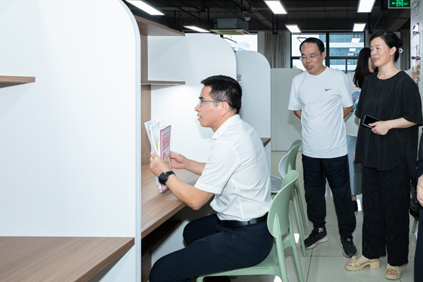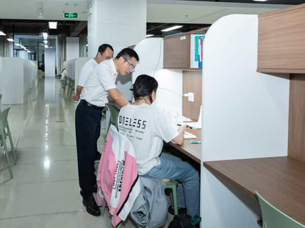 丁敢真一行首先来到三楼新改造的毕业班考研专间。该区域以“静心·便捷·自律”为设计理念,由学生自我管理,实现长期预约,消除占座焦虑。专间采用相对隔断的单人卡座模式,一人一桌,隔断干扰,利于沉浸式学习。310个专座布局合理、光线柔和,均配备有独立五孔插座和智能可调节感应阅读灯,为学生提供了安静、便捷、高效的个人学习空间。丁敢真细致察看座位设置和设备配置情况,并体验了座椅舒适度和阅读灯、插座使用的便利性,对图书馆从学生实际需求出发、优化空间功能的做法表示充分肯定。